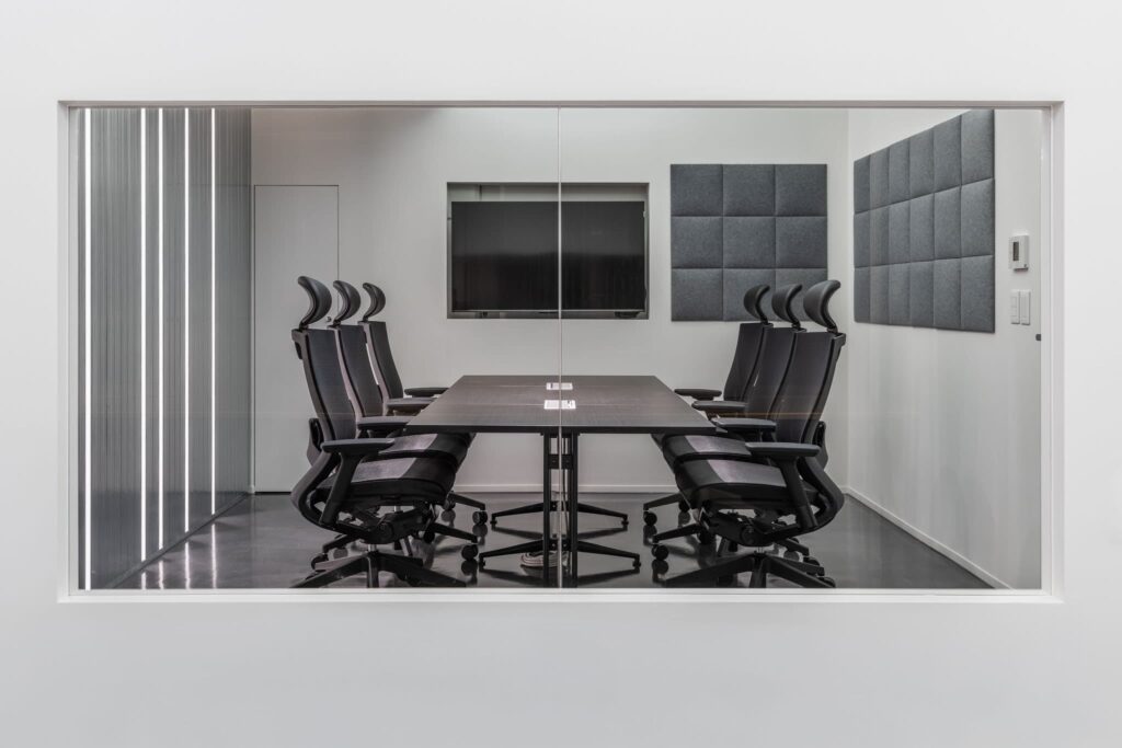 4つの会議室のうち8人用・6人用・4人用の3室は、家具を内包する空間そのものをショーケースに見立て、ガラス面をインターフェースとして設計されています。ここでは「トリミング」と「レイヤーコントロール」という二つの手法を用い、各室のサイズや家具配置、照明が生み出す空間を恣意的に切り取り、編集。外からの視線はハーフミラーフィルムやファブリックのレイヤーによって段階的かつ機能的に制御されます。