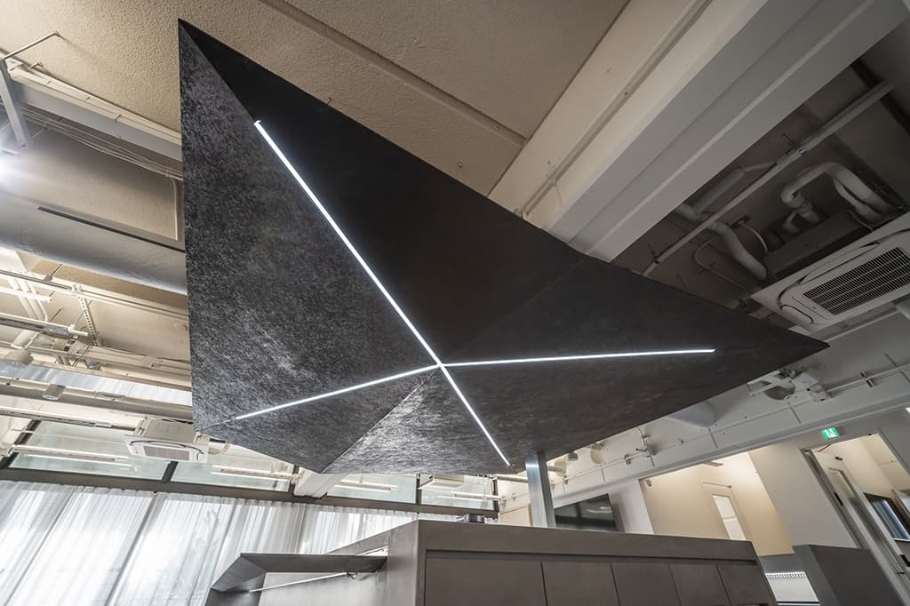 ワークスペースの中心、フリーアドレスエリアに大小短長の円柱状ボリュームとして点在するのは、作家 fab-(ふぁぶう)氏のファブリックアート。空調の風に揺らぎながら佇むこれらの作品は、ワークプレイスに自然な彩りを添えるインテリアグリーンに替わる新たな試みとして導入しました。外光や照明の色変化に呼応して表情を変え、淀屋橋という都市的なオフィスにおける日常の移ろいを、ひとつの体験として静かに可視化します。