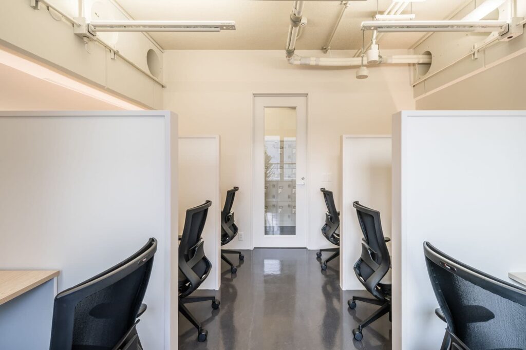 4つの会議室(ミーティングルーム)と2つのフォンブースのご利用は予約制。最小1時間から、以降15分単位での延長が可能です。